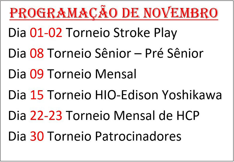 19/11/2025: Torneio Stroke Play - Novembro 2025 Acontece nos dias 1 e 2 o Torneio Stroke Play - Novembro 2025.