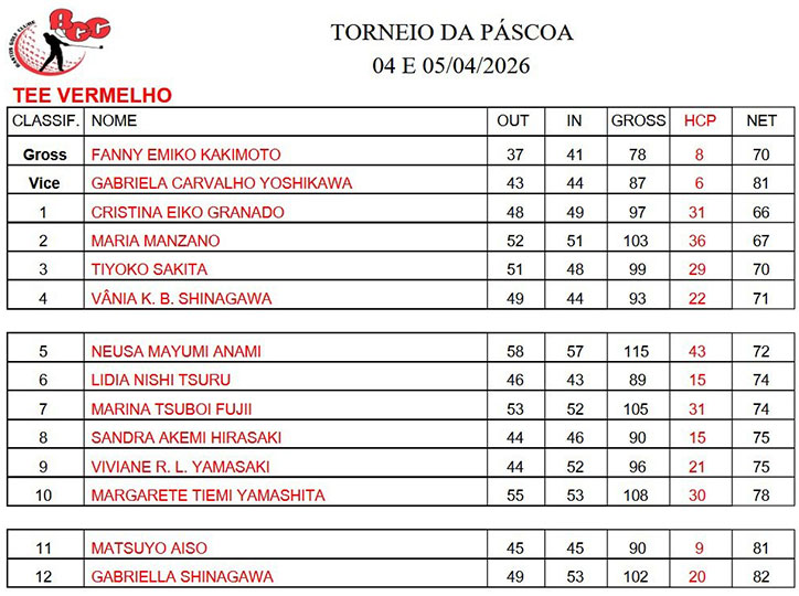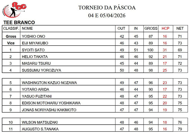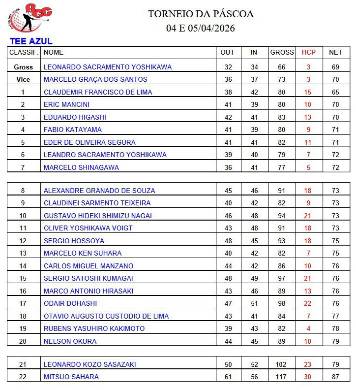 12/04/2026: Torneio Mensal de Handicap – Abril 2026 Torneio Mensal de Handicap foi realizado no dia 12 de abril de 2026 no Bastos Golf Clube.